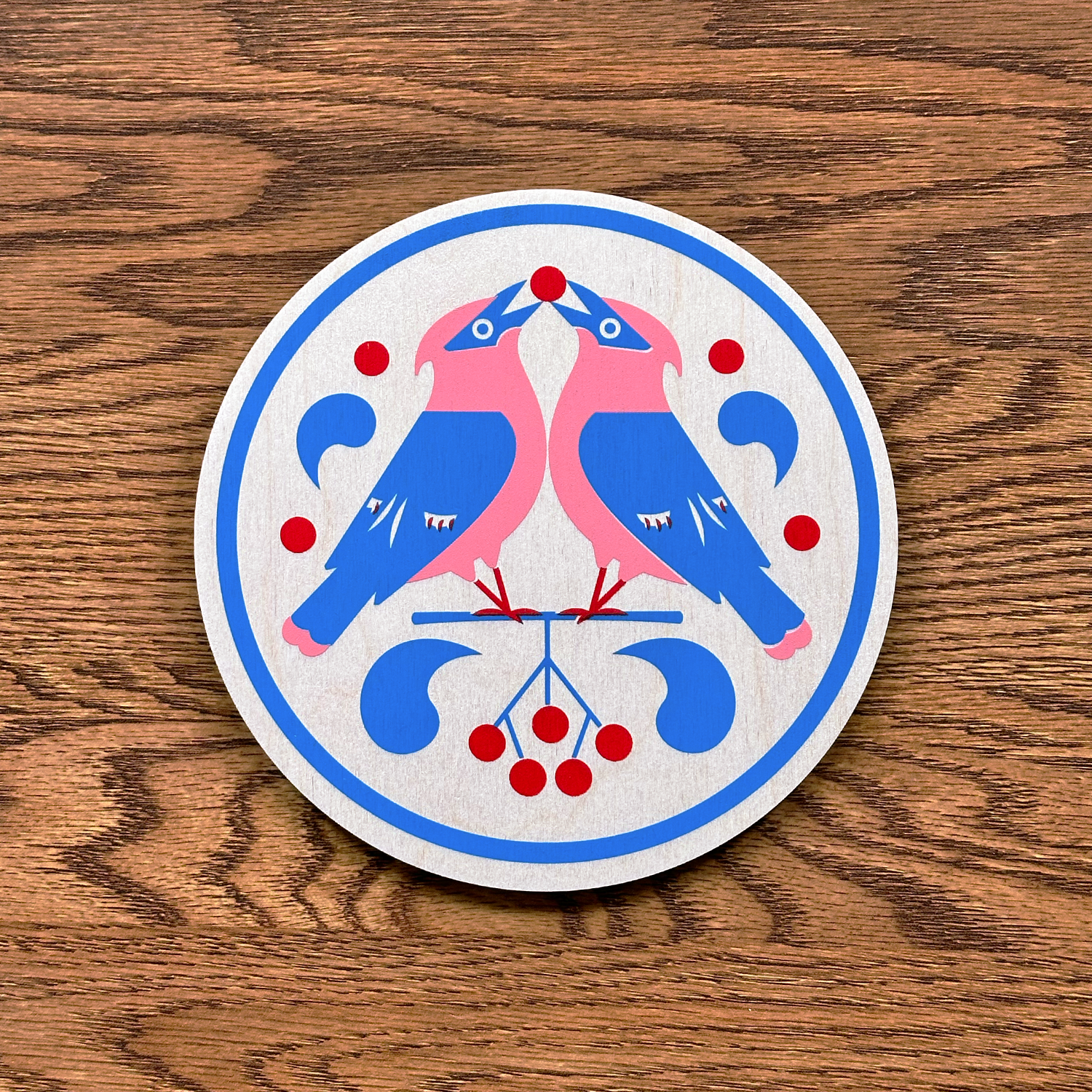 Inspired by historic Pennsylvania Dutch hex signs, this hex features two mirrored Cedar Waxwings exchanging a tasty berry.