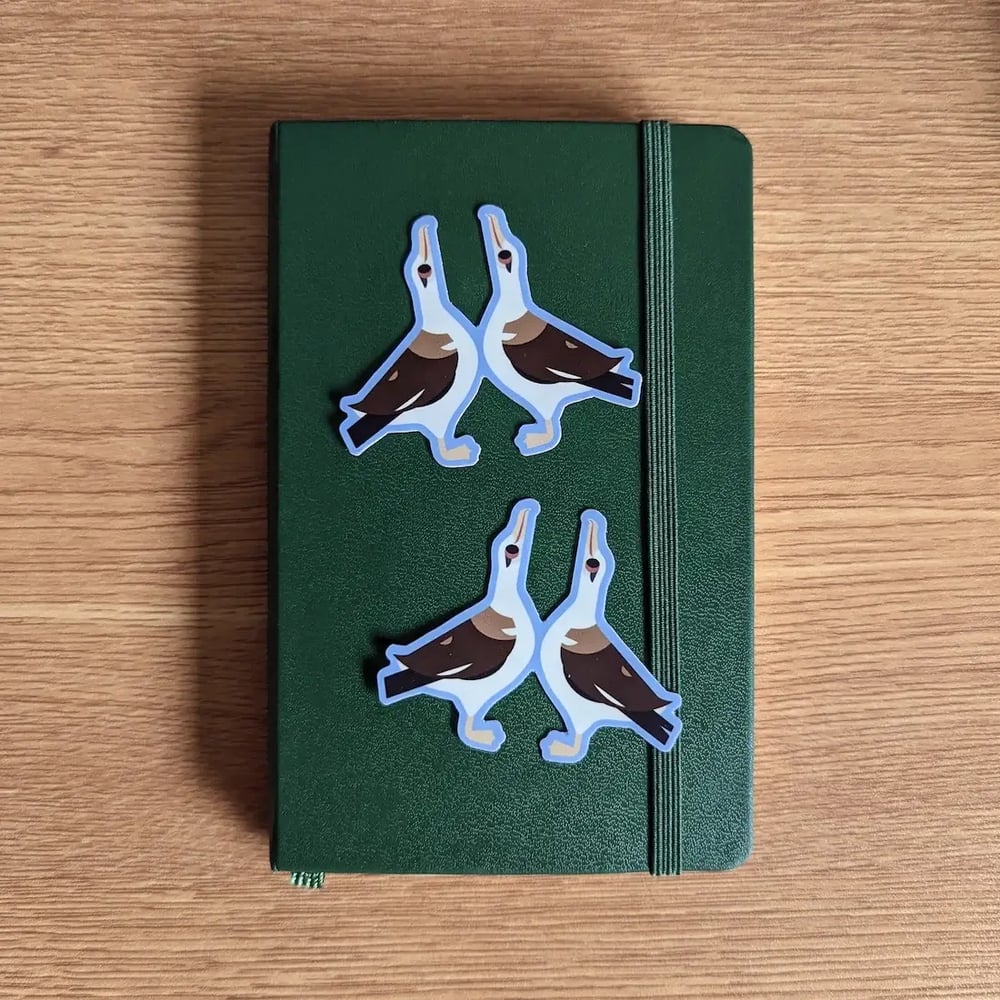Inspired by the very endearing courtship dance of the Laysan Albatross! This design is printed on a durable, die cut sticker that can be reapplied a few times